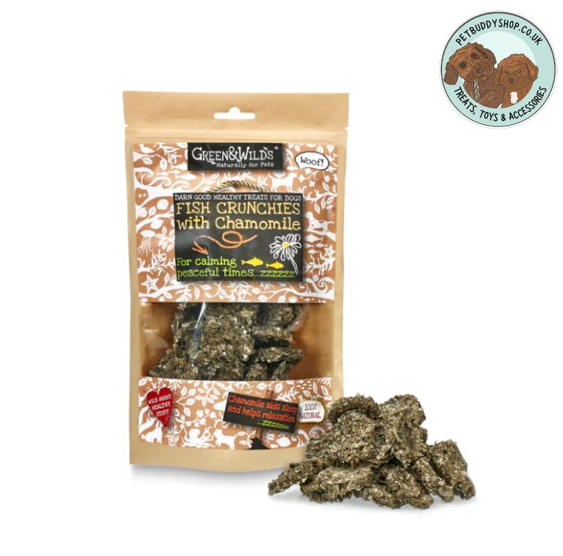 Help your dog feel calm, content, and happy with Green & Wild’s Fish Crunchies with Chamomile — premium natural dog treats in the UK made with high-quality fish and calming chamomile.