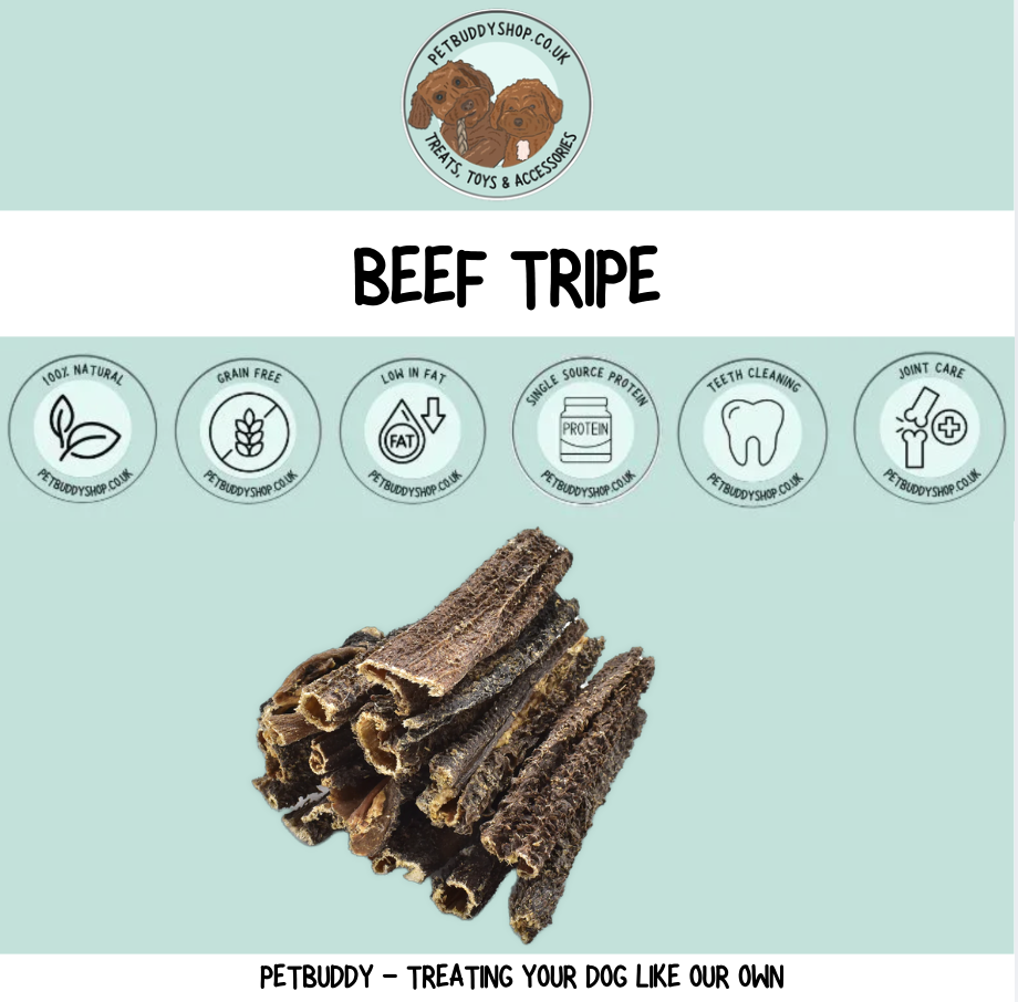 In supporting your dogs health, Beef Tripe is the perfect choice. It's a 100% natural, high-quality beef dog treat. Packed with amino acids, protein and low in fat.